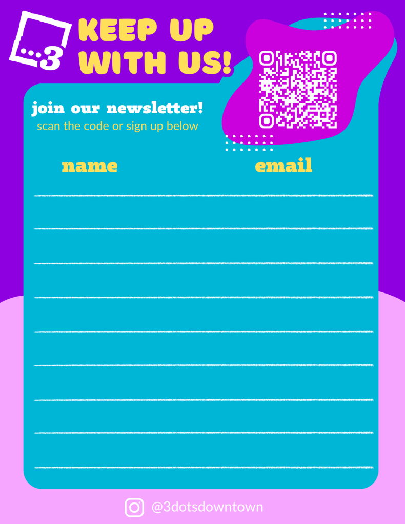 I designed custom newsletter sign-up sheets for 3 Dots Downtown’s in-person events to help grow their community and keep attendees connected. The layouts reflect the brand’s creative, inclusive spirit while remaining simple and easy to use. These sheets strike a balance between inviting design and practical functionality, encouraging engagement during live events.