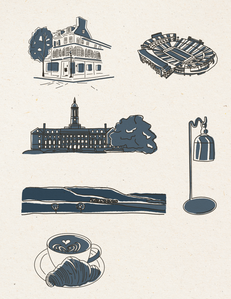 A custom set of organic, sketch-style illustrations featuring offset color fills to evoke a warm, handcrafted feel. Designed to capture the spirit of the local community, these illustrations celebrate the charm, history, and iconic landmarks that draw people to Hotel State College’s properties and the heart of downtown. Created for use across social media, digital campaigns, and print collateral, the series brings a playful yet refined aesthetic to the brand’s storytelling.